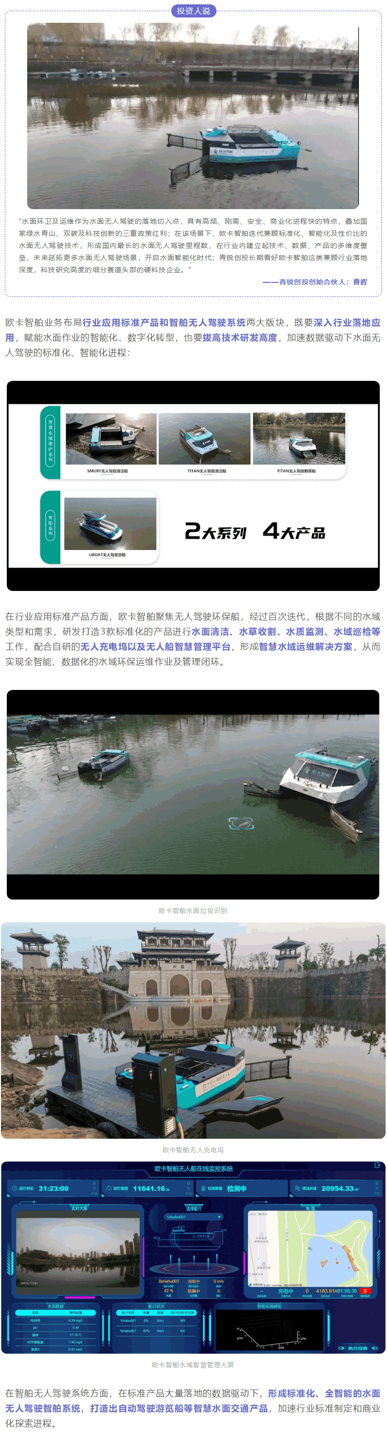 近期,无人船创业公司欧卡智舶已完成A+轮融资,融资金额达5000万元,L投方为青锐创投,中信建投资本、中关村中诺基金、光远投资、启迪之星等多家队机构跟投。欧卡智舶新一轮融资将主要用于无人驾驶环保船产品、游船产品和智舶无人驾驶系统的持续研发,国内及海外的销售网络与品牌的加速建设与推广,行业标准制定,上下游产业链布局等。继无人机、无人车之后,无人船行业近年来加速发展,通用汽车、丰田、劳斯莱斯、韩国现代重工、IBM等巨头相继布局水面无人驾驶,欧卡智舶结合技术G度与场景特点,走出一条快速稳健的道路。 欧卡智舶创立于2017年,是国内的水面无人驾驶核心系统提供商及水环保行业赋能者,产品线覆盖无人驾驶环保船、智能载人游船等整船产品,并研制出行业的智舶无人驾驶系统,可为新行业应用水面无人驾驶技术提供标准化解决方案,目前是拥有行业长无人驾驶里程数和个水面无人驾驶样本集的JG新技术企业。无人驾驶环保船产品现已推广至十个的上百个水域,成为该细分赛道出货量D一的无人船企业;近期新研发的个标准化智能载人游船产品已逐步投入各大知名景区使用,并申请交通部J智能航运先导示范区。